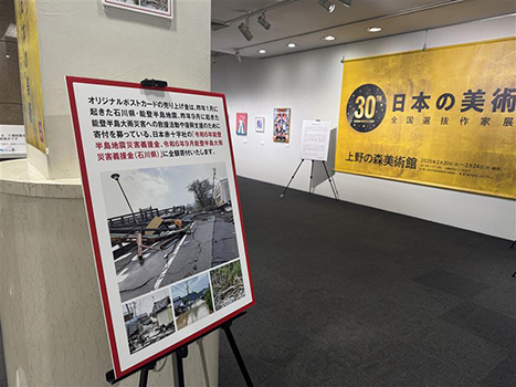 上野の森美術館にて開催した「第29回 日本の美術 ~全国選抜作家展~」ではご出展作品を1枚100円のポストカードにして販売。その売上金337,700円を、年始に能登半島を襲った地震の被災地の方々の生活を支援するための義援金として全額寄付させていただきました。