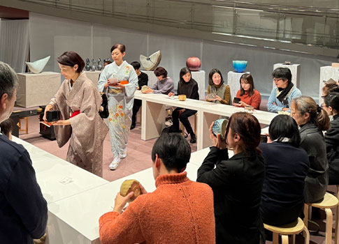展示会場では、公益社団法⼈美濃陶芸協会会⻑ 安藤 ⼯⽒、副会⻑ 阪⼝浩史⽒、加藤三英氏によるギャラリートーク、出展作家の茶碗を使っての特別茶会が賑やかに行なわれました。
