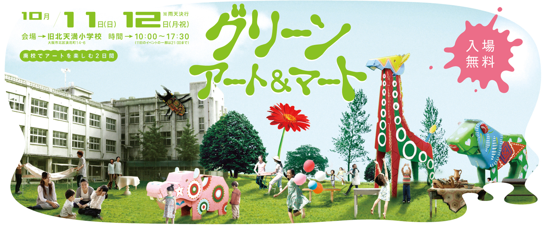 廃校になった旧北天満小学校の講堂と芝生グラウンドを舞台に、地域活性化を図るアートイベントを開催。エコ&アートの視点から楽しみを「再発見」するアートマーケットやワークショップを実施しました。