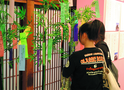 会期を通して展覧会場内に募金箱を設置し、来場者に協力をお願いするとともに、短冊に被災地への応援メッセージを書き、復興への祈りを込めて笹に結わえていただきました。心の込もった応援メッセージの一部は、記念作品集に掲載し、被災地へ寄贈いたします。
