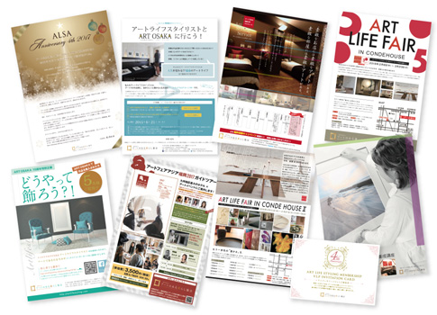 個展やグループ展など展示会を開催する際に必要となる告知チラシやポスター、招待状、会場に設置する名刺や出品目録、販売用の画集、ポストカードなどをまとめて制作します。