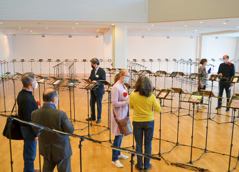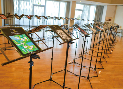 楽聖の生誕250年を記念し開催する本展では、彼の偉大な業績を称えるとともに、日本人芸術家の創作を交響曲第9番《歓喜の歌(通称:第9)》の楽譜の表紙にあつらえ、ドイツの福音派ハウス・ボンで展示しました。全アーティストの作品が表紙にデザインされた楽譜を譜面台に並べ、「美と音楽の饗宴」として魅せる、新たな展示方法で展覧しました。