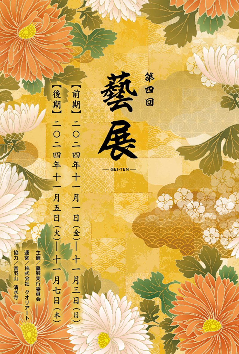 美術展覧会「藝展」は、平安建都1200年の節目となった1994 年より、前身である「清水寺 古と優艶の書画展」と題してスタートしました。改称後も、『源氏物語』をはじめとする文学物語や仮名文字に代表される国風文化が花開いた古都・京都で、多くの人々が参拝に訪れてきた古刹、音羽山清水寺を舞台に、日本の多様な芸術の魅力を世界に発信しています。