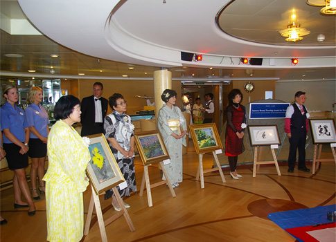 作品はデッキ8(8階)の海を見渡すパノマラウンジと、デッキ6(6階)にあるショーラウンジに展示され、各国から訪れた乗船客や寄港先のイタリア、フランス、スペインから特別に招待された地元のゲストが鑑賞。日本美術の粋を集めた船上の美術館を思い思いに楽しみました。